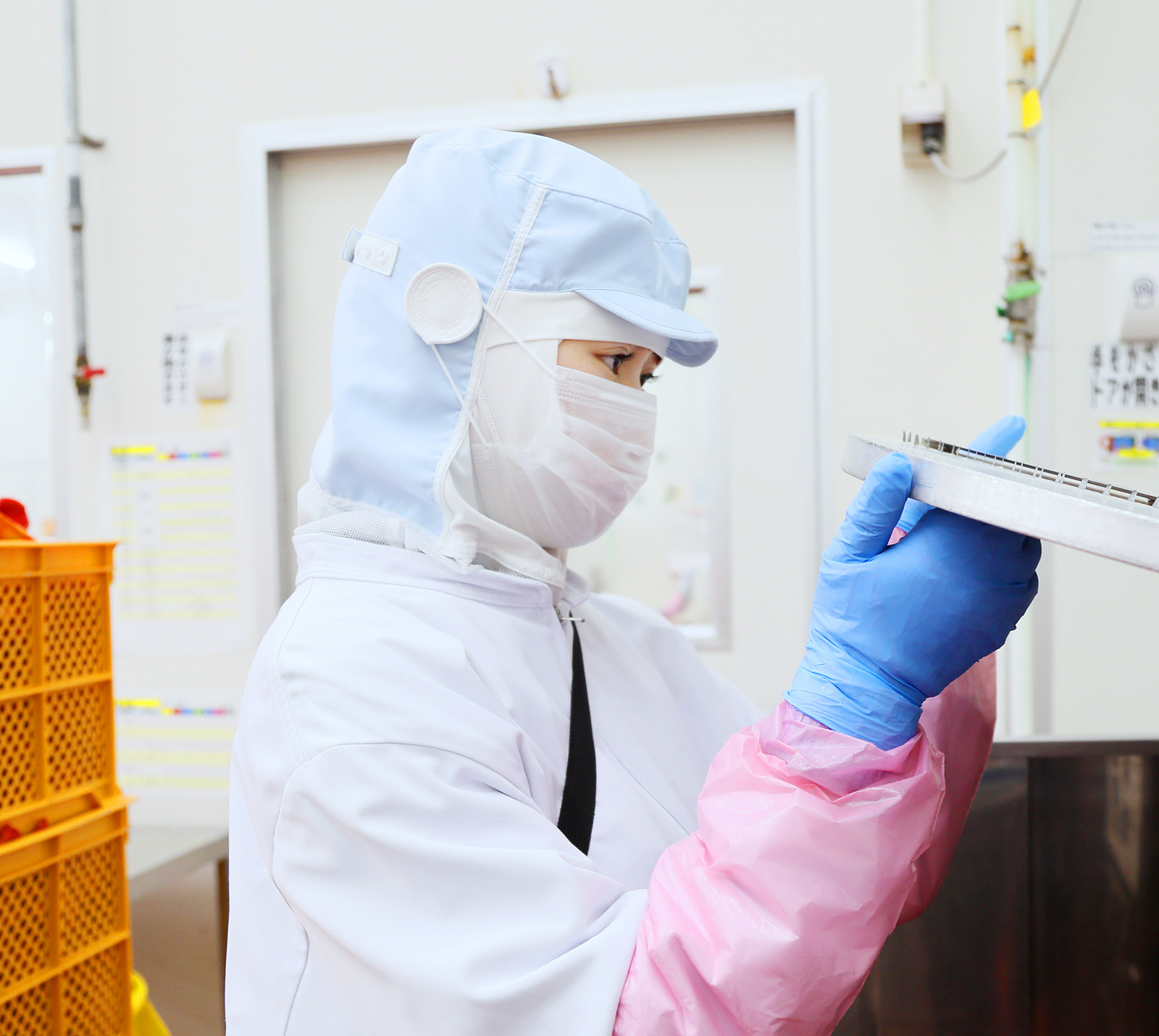 パートスタッフに対する、毛髪やプラスチックの破片などが商品に混入しないための指導や、ユニフォームに付着する小さなゴミや埃の除去作業など、工場の衛生管理および商品の品質管理を行っていただきます。また、スタッフが使用する包丁やピーラーなどの帳票管理も行い、より生産性の高い環境を整備します。