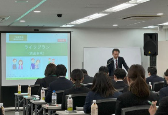 具体的な講義例として「ライフプランと資産形成」も用意しています。将来の支出や資産運用の手段を学ぶことで、仕事のみならず、これからの豊かな人生設計をサポート。合同研修を通じて、自分自身のキャリアと真剣に向き合う時間を大切にしています。