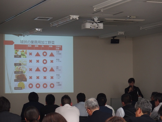 今回は、「健康寿命の時代をむかえ、これからの野菜ビジネスを考える」ということで、弊社の親会社となる デリカフーズ株式会社 代表取締役社長 丹羽より、食と健康寿命の関わりや、これからの野菜の販売方法・ご提案などについてお話をさせていただきました。「食で健康寿命を延ばす」ということで、いかに普段の食生活が重要か、また、「生命食」というキーワードを用いてお話をさせていただきました。会場に来てくださったお客様からは、「健康寿命を延ばす生命食の普及に、外食産業として貢献したい」「お客様の健康を考える良いきっかけになった」などのお言葉を頂戴致しました。今後は、お客様のお客様となる一般消費者の方々へも、しっかりと想いが伝わるように、デリカフーズグループが先頭をきって新たな野菜の価値創造に向け情報発信をして参ります。